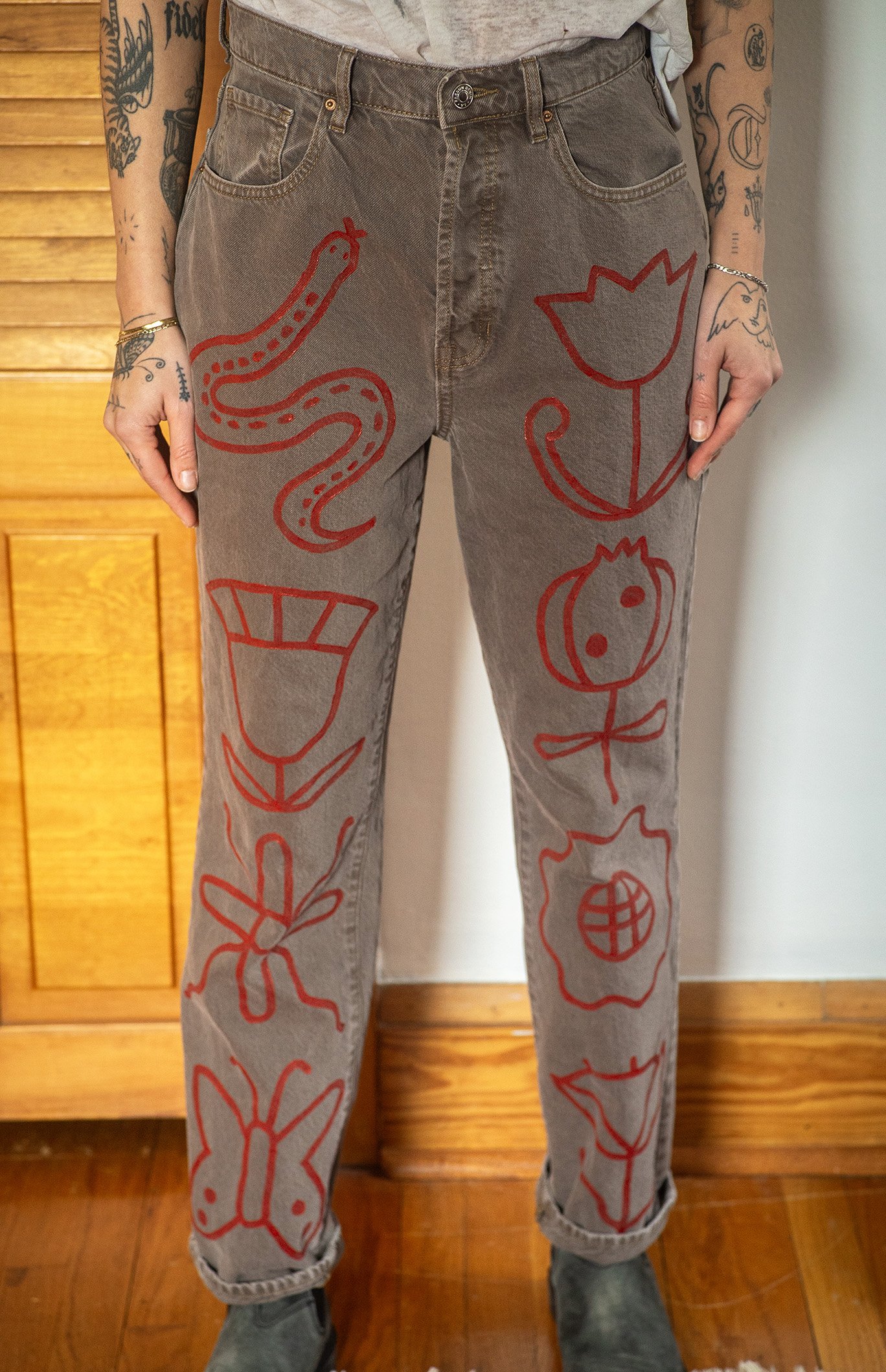 Brownish-grey button fly relaxed denim with red paint.