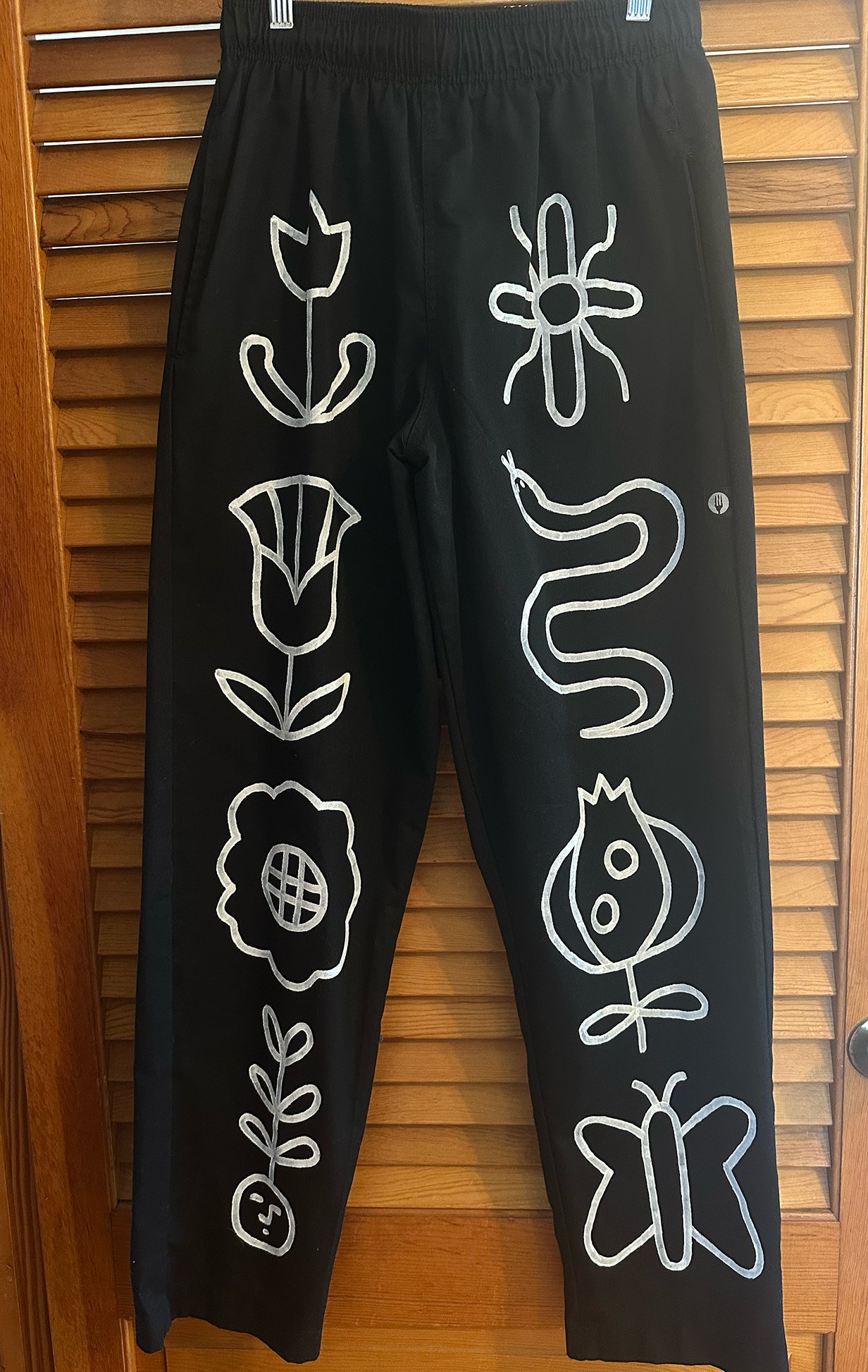 Black elastic waist chef pants with white paint