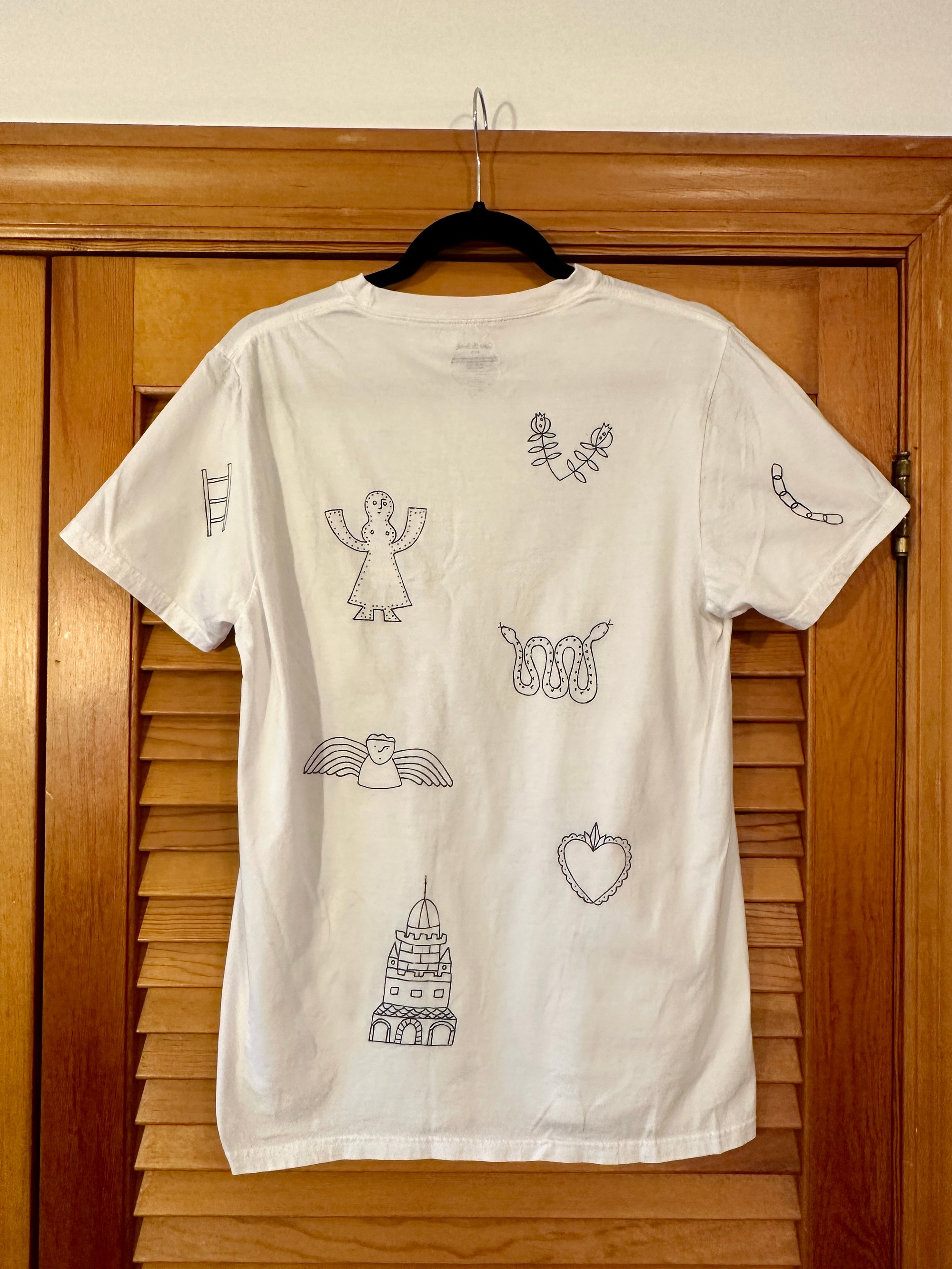 White cotton t-shirt with black fabric marker tattoo design